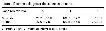 Se encontró diferencia estadísticamente significativa entre el grosor de la capa íntima sana y la enferma, y entre el de la capa media sana y enferma. La íntima se ha engrosado y la media se ha adelgazado (Tabla I).
