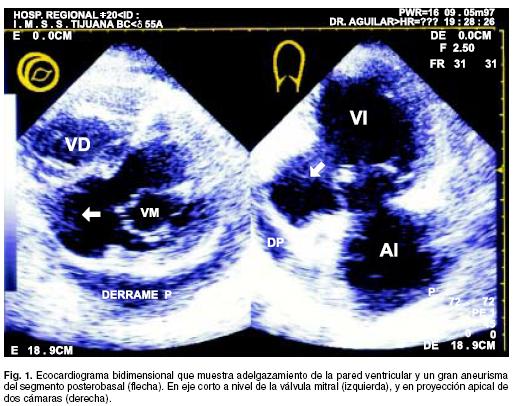 Masculino de 55 años de edad, con historia de hipertensión arterial y dislipidemia. En enero de 1997, desarrolla evento isquémico coronario, que culmina con infarto al miocardio de localización postero-inferior con extensión al ventrículo derecho. Su evolución hospitalaria es tórpida, requiriendo de cargas de volumen y del uso de aminas presoras intravenosas. Cuatro meses después al egreso hospitalario, manifiesta arritmias cardíacas y datos de disfunción ventricular. Un electrocardiograma en ritmo sinusal, con zona inactivable inferior y latidos ectópicos ventriculares multimórficos con un comportamiento frecuente. Una radiografía de tórax con cardiomegalia leve. Se realizó estudio ecocardiográfico que reveló aumento de los diámetros ventriculares, con la formación de un gran aneurisma posterobasal del ventrículo izquierdo (Fig. 1), sin demostrar la presencia de trombo en su interior, la función ventricular fue limítrofe. Además de presentar un derrame pericárdico de moderada cantidad. El paciente quien se encontraba hospitalizado para manejo de falla cardíaca, desarrolla muerte súbita.