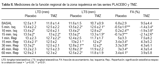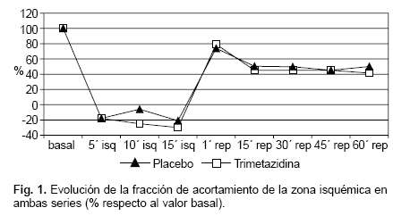 Al igual que en estudios previos,20 en nuestro modelo experimental de aturdimiento miocárdico observamos que la TMZ no ejerce ninguna modificación en las variables hemodinámicas, con unos valores similares entre el grupo tratado y el grupo Placebo, tanto en situación basal como durante la realización del protocolo de isquemia-reperfusión. Cuando analizamos los datos de función segmentaria de la zona sometida a isquemia tampoco hemos encontrado diferencias significativas de la TMZ con respecto al grupo Placebo, con una evolución de la fracción de acortamiento de la zona isquémica similar a lo largo de todo el experimento: disminución de los valores de la FA a cifras de acinesia-discinesia durante la obstrucción coronaria, con importante recuperación de sus cifras durante los primeros momentos de reperfusión y posterior empeoramiento progresivo a lo largo de la reperfusión, alcanzando valores del 41% a los 60 minutos (aturdimiento miocárdico). Estos resultados vienen a confirmar los hallazgos de Vedrinne y colaboradores sobre un modelo isquémico muy similar al nuestro, pero con una pauta de dosificación de la TMZ diferente (tratamiento previo oral durante sólo 3 días, seguido de infusión intravenosa durante la experimentación) y en el que no encuentran diferencias en el aturdimiento miocárdico ni en la reserva contráctil del miocárdico isquémico en la serie canina tratada con TMZ.21