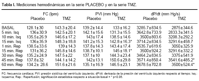 Debemos de señalar que, si bien los animales de ambos grupos no parten en situación basal en las mismas condiciones en cuanto a las variables hemodinámicas, no se encuentran diferencias estadísticamente significativas entre ellos. Así, el grupo tratado con TMZ presentó unos valores de FC basal ligeramente superiores en 11% (ns), mientras que el grupo Placebo partió de unos valores de dP/dt y PVI ligeramente superiores a la serie TMZ en 16% y 4% respectivamente (ns). Cuando analizamos la evolución de la FC, observamos que, si bien ésta no presentó variaciones significativas en ambas series a lo largo de toda la experimentación, los incrementos respecto al valor basal tienden a ser discretamente superiores en la serie Placebo, y únicamente encontramos diferencias entre ambos grupos alos5minutosde iniciada la obstrucción coronaria (p<0.05).