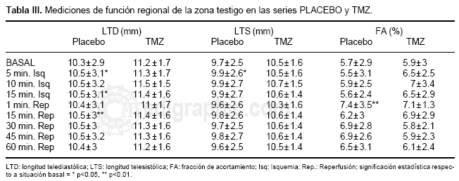 Objetivo: Evaluar la acción de la trimetazidina en el deterioro de la función sistólica que se produce en el miocardio tras una isquemia única y prolongada. Métodos: Se analizaron 13 perros mestizos, de uno u otro sexo, asignados al azar a tratamiento oral con trimetazidina (6 perros) o placebo (7 perros) durante 7 días. Se realizó un protocolo de isquemia bajo anestesia consistente en una obstrucción completa de la arteria coronaria descendente anterior de 15 minutos de duración, seguida de 60 minutos de reperfusión. Las variables analizadas durante la obstrucción y la reperfusión fueron: Frecuencia cardíaca (FC), presión ventricular izquierda (PVI), dP/dt y las curvas de función regional de la zona isquémica y de una zona testigo (longitud telediastólica, telesistólica y fracción de acortamiento). Resultados: Las variables hemodinámicas (FC, PVI y dP/dt), no presentaron diferencias significativas entre ambos grupos, con poca variabilidad de sus valores respecto a los basales durante la isquemia-reperfusión. La fracción de acortamiento de la zona isquémica experimentó una disminución estadísticamente significativa durante la obstrucción coronaria en ambas series, alcanzando valores de discinesia, con persistencia de la disfunción contráctil tras 60 minutos de reperfusión, y sin diferencias entre ambas series (50% serie Placebo; 41% serie Trimetazidina). Conclusiones: La recuperación de la contractilidad miocárdica tras una isquemia completa en la serie tratada con TMZ no mostró diferencias significativas respecto a la serie Placebo, a diferencia de lo que ocurre con períodos de oclusión más cortos y repetidos.