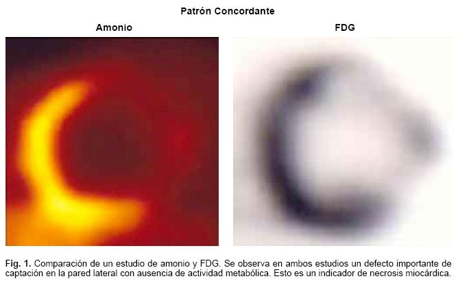 Existen tres patrones diferentes al realizar estudios de viabilidad miocardica con PET, los cuales surgen de la correlación entre el estudio de perfusión miocardica ya sea con SPECT o con el radiofármaco 13Namonia mediante PET y el estudio utilizando FDG con PET. Si la captación tanto en el estudio de perfusión como en el estudio con FDG está reducida o ausente, se le denomina patrón "concordante" (Fig. 1). Basados en la severidad del déficit de perfusión y de FDG se puede clasificar como una concordancia transmural (ausencia o disminución marcada de la perfusión y de la captación de FDG) o una concordancia no transmural (ligera o moderada reducción de la perfusión y de la captación de FDG). Estos dos términos fueron utilizados originalmente para indicar que la concordancia transmural implica la presencia de un infarto transmural y que la concordancia no transmural, sugiere la presencia de una combinación de tejido viable y no viable en una región miocardica dada y por lo tanto necrosis miocardica no transmural.21 Cuando la captación miocardica de FDG se incrementa desproporcionadamente comparado con la perfusión miocardica regional, el patrón es llamado "discordante" (Fig. 2). Este patrón representa el miocardio hibernante. La disfunción regional debida al aturdimiento miocárdico puede manifestarse por un flujo sanguíneo y una utilización de glucosa normal, aumentada o reducida.