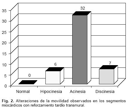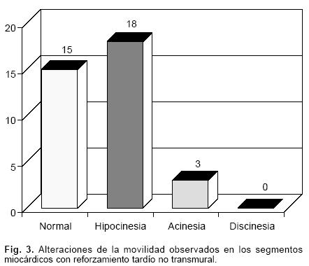 En nueve de los pacientes se valoró la movilidad ventricular y su correlación con el grado de reforzamiento tardío (mayor o menor al 50% del grosor de la pared). Se analizaron un total de 153 segmentos miocardicos, donde 72 no mostraron reforzamiento tardío, 36 tuvieron un reforzamiento no transmural y 45 transmural. De los 45 segmentos en donde el reforzamiento tardío fue transmural (>50% del grosor), se encontró discinesia en 7 (15%), acinesia en 32 (71%) e hipocinesia en 6 (14%) de ellos, no encontrándose ningún segmento con movilidad normal (Fig. 2). En el grupo de segmentos con reforzamiento tardío no transmural (<50%), en 15 (42%) se encontró movilidad normal, en 18 (50%) se observó hipocinesia y en 3 (8%) se observó acinesia, sin hallar ningún segmento discinético (Fig. 3).