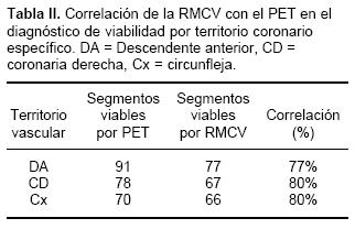 Resultados: Se estudiaron 289 segmentos miocárdicos, PET detectó 239 (82.7%) segmentos viables y 50 (17.3%) segmentos no viables, con RMCV se encontraron 210 (72.6%) segmentos viables y 79 (27.4%) segmentos no viables. Ambas técnicas coincidieron el 75% de las veces y al analizarlo por territorio coronario específico la correlación fue muy buena.