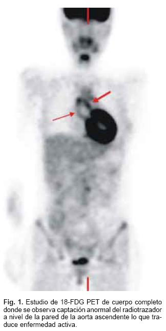 Para la realización del estudio de cuerpo completo con PET, en estado de ayuno de 8 horas, se administraron por vía venosa 15 mCide 18fluorodeoxiglucosa, posteriormente se tomaron imágenes a las tres horas con el sistema ECAT EXACT HR+ (CTISiemens, Knoxville, Tena EUA), las imágenes fueron reconstruidas de manera automática. En las imágenes de cuerpo completo se observó captación incrementada de FDG a nivel de la aorta ascendente, cabe resaltar que en las imágenes de cuerpo completo normalmente no existe captación a este nivel (Fig. 1).