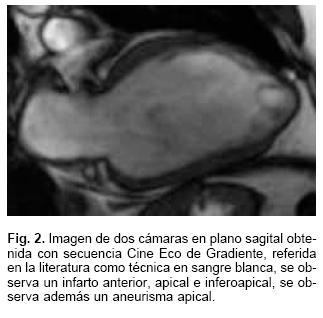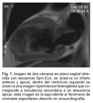 a) Las secuencias SpinEco (se les ha llamado técnica de sangre negra) son utilizadas para estudiar morfológicamente al corazón, estas imágenes son estáticas, ya que se adquieren en la fase diastólica en la cual el corazón presenta menos movimiento, estas secuencias son ideales pues nos permiten ver de una manera clara la interfase sangre/endocárdico y así poder determinar la presencia de dilatación de las cavidades, establecer la presencia de aneurismas o pseudonaneurismas (Fig. 1).