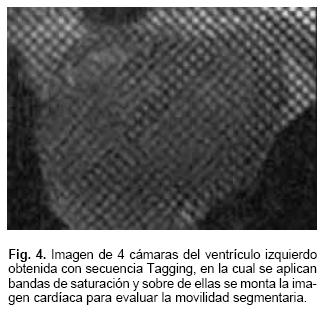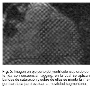 c) La movilidad segmentaria del corazón ha puesto a algunas técnicas de imagen (ecocardiografía) en entredicho ya que se tiende a ser muy subjetiva y depende de la experiencia del operador, mediante las técnicas de RMC se ha eliminado este problema, ya que al aplicar secuencias Tagging (se aplican bandas de saturación y sobre éstas se monta el segmento del miocardio a estudiar) observando de manera bien definida la deformación de la pared miocardica en cada contracción, pudiendo evaluar segmento por segmento, evitando así lo subjetivo de otras técnicas (Figs. 4 y 5).