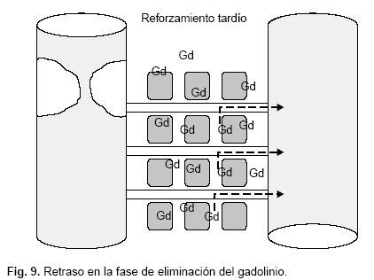 El mecanismo fisiopatológico que explica la presencia de RT en todas las miocardiopatías son consecuencia de una alteración en la cinética del Gd, ya sea por alteraciones en su fase vascular, fase de captación retrasada (wash in lento) por trastorno en la microvasculatura o bien por un incremento en la estancia del Gd a nivel intersticial (wash out retrasado) (Fig. 8), ya que la fase intersticial del gadolinio es de entre 170 a 250 mseg. Dicho retraso en la fase intersticial puede estar ocasionado por incremento en el espacio intersticial en el cual se deposita el Gd, por una disminución en la densidad capilar que se encarga de la fase de lavado del material de contraste o bien por disruption de la célula miocárdica en la cual es secuestrado el gadolinio dificultando así su lavado15 (Fig. 9).