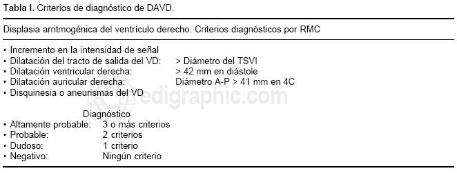 Otra patología de trascendencia por su alta letalidad, es de las principales causas de muerte súbita en jóvenes en Europa,11 es la displasia arritmogénica del ventrículo derecho para la cual ya hay criterios de diagnóstico bien establecido mediante RMC (Tabla I) según lo ha descrito Midiri.12