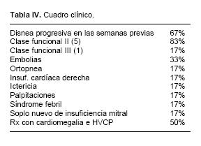 El cuadro clínico durante la DOIP fue insidioso en todos, la disnea progresiva en las semanas previas, fue el síntoma predominante (67%), llegando cinco pacientes en clase funcional II y un paciente en clase funcional III (17%). Otros síntomas incluyeron embolismo (33%), ortopnea (17%), insuficiencia cardíaca derecha (17%), ictericia (17%), palpitaciones (17%) y síndrome febril en un caso (17%). La exploración física fue normal o sin cambios en la mayoría (83%) y sólo en un paciente se detectó un nuevo soplo de insuficiencia mitral (17%). En la Rx de tórax de ingreso se encontró cardiomegalia e hipertensión venocapilar pulmonar moderada en el 50% de pacientes (Tabla IV).