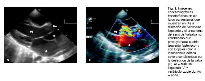 Se ha considerado a los aneurismas de los senos de Valsalva como malformaciones congénitas ya que la patología fundamental de este tipo de anomalía es la separación entre la capa media de la aorta y el sitio de inserción de las valvas aórticas en su porción posterior.3 La capa media de la aorta se retrae y no forma parte del seno de Valsalva dilatado, el cual está formado de fibras de colágeno densas sin fibras musculares o tejido elástico. También se presentan secundarios a otras enfermedades sistémicas como sífilis, ateroesclerosis y endocarditis bacteriana. Cuando son adquiridos por lo general involucran a más de un seno de Valsalva y raramente se asocian a otras malformaciones congénitas, sin embargo, en ocasiones puede ser imposible determinar si la endocarditis es la causa o consecuencia del aneurisma. El seno coronariano anterior o derecho es el más frecuentemente involucrado, el no coronariano o posterior derecho está afectado en el 20% aproximadamente y el menos afectado es el seno coronariano izquierdo.4 Los aneurismas no rotos pueden comprimir las cavidades cardíacas, las estructuras vasculares adyacentes o entrar al espacio pericárdico. Se han reportado casos de obstrucción a la vía de salida del ventrículo derecho,5,6 del ventrículo izquierdo,7 disección de septum interventricularu obstrucción coronaria.8 La aorta ascendente por lo general se encuentra dilatada.