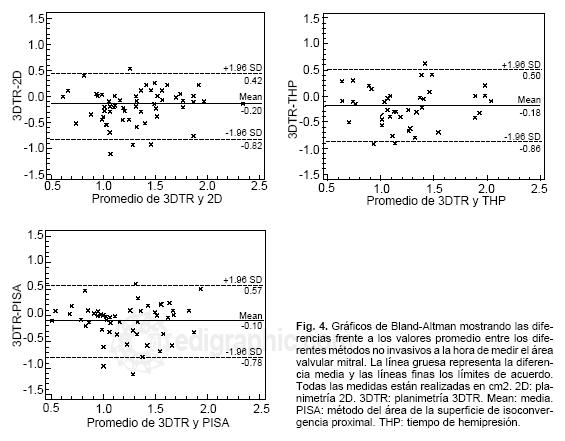 El área mitral media determinada por los diferentes métodos fue THP: 1.4 ± 0.4 cm2; planimetría 2D: 1.4 ± 0.4 cm2; PISA 1.24 ± 0.39 cm2; planimetría 3DTR: 1.26 ± 0.43 cm2 y por el método de Gorlin: 1.30 ± 0.48 cm2 (Tabla I). La comparación de los diferentes métodos mediante el coeficiente de regresión lineal, el coeficiente de correlación intraclase (Tabla I) y el método de BlandAltman (Fig. 3), mostró que el área valvular mitral determinada mediante el método de Gorlin tiene mejor correlación con la obtenida por planimetría 3DTR que con la determinada por los otros métodos no invasivos (planimetría 2D, PISA y THP). Asimismo, se valoró el acuerdo entre la valoración, mediante el método de BlandAltman, realizada con planimetría 3DTR y planimetría 2D, THP y PISA, mostrando resultados aceptables (Fig. 4).