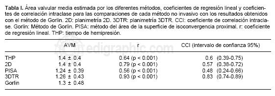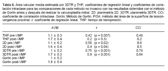 En el grupo de pacientes sometidos a VMP, el área mitral obtenida preVMP por los diferentes métodos fue: THP: 1.1 ± 0.3 cm2, planimetría 2D: 1.1 ± 0.2 cm2, planimetría 3DTR: 1 ± 0.2 cm2 y método de Gorlin: 1 ± 0.2 cm2. El AVM determinada por los diferentes métodos en el período post VMP inmediato fue: THP: 1.7 ± 0.4 cm2, planimetría 2D: 1.6 ± 0.4 cm2, planimetría 3DTR: 1.7 ± 0.3 cm2 y mediante el método de Gorlin: 1.8 ± 0.4 cm2 (Tabla II).