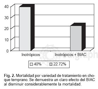 En el grupo de choque temprano, con el tratamiento a base de inotrópicos, se encontró una mortalidad del 40% (n = 2) mientras que con el tratamiento a base de inotrópicos + BIAC la mortalidad fue del 22.7% (n = 5, razón de momios 0.44 IC95% 0.050.8, p < 0.05) (Fig. 2).