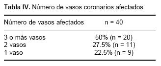 Todos los pacientes fueron sometidos a angioplastía percutánea previo a la aparición del choque cardiogénico, en todos los casos antes de la revascularización se administró tratamiento médico. El tiempo medio transcurrido entre el inicio de los síntomas y la realización de la angioplastía en el grupo de choque temprano fue de 3.2 h. mientras que en el grupo de choque tardío fue de 4.6 h. (Siendo el tiempo determinado por las condiciones del paciente y su respuesta al tratamiento médico). En todos los casos invariablemente, se colocaron stents en los vasos responsables del infarto (1 vaso afectado 50%, 2 vasos afectados 27.5%, 3 vasos afectados 22.5%). El número de vasos coronarios afectados y la mortalidad por vasos afectados fue mayor en la enfermedad de 3 o más vasos (57% en choque temprano y 50% en choque tardío, p < 0.05 y p < 0.01 respectivamente) (Tablas IV y V). Mientras que el vaso coronario más comúnmente afectado fue la arteria descendente anterior en un 60% de los casos cuya mortalidad fue del 41.6% (Tablas VI y VII).