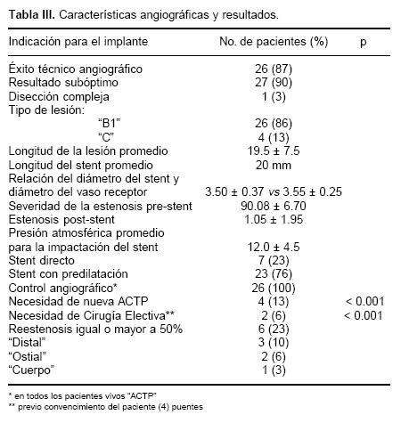 En el GACTP se obtuvo control angiográfico en todos los pacientes vivos a los seis meses del seguimiento 26 (100%). Los tipos de stents utilizados fueron Jostent Flex 10 (33%), con técnica de predilatación nueve y uno stent directo, en el seguimiento a los seis meses encontramos un caso con reestenosis 50%, motivo por el cual se realizó nueva ACTP del vaso culpable a 14 atm sin lesión residual. BX Velocity en seis (20%), a tres se realizó con técnica de predilatación y tres fueron directos. De este grupo en el seguimiento encontramos dos casos con reestenosis por lo que se realizó nueva ACTP a 16 y 20 atm Palmaz/ Schatz en tres (10%) con técnica de predilatación en dos y uno directo, en el seguimiento sin reestenosis. Crown en cuatro (13%) todos con predilatación, AVE entres (10%) dos directos y uno con predilatación. Express dos (6%) ambos con técnica de predilatación sin reestenosis en el control. NIR Royal sólo uno (3%) con técnica de predilatación sin reestenosis en el control. Cross Flex uno (3.3%) con técnica de stent directo. Sin reestenosis en el control, en total fueron colocados 23 stents con técnica de predilatación y siete directos (Tabla III).