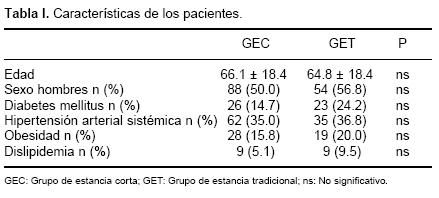 Los pacientes se dividieron en dos grupos, el grupo de pacientes de estancia tradicional (GET) y el grupo de pacientes de estancia corta (GEC). Cabe mencionar que el primer grupo se constituyó por pacientes que ingresaban tradicionalmente y por aquellos otros que ingresaron por el Servicio de Admisión Continua porbradiarritmias graves, por tanto no fue un grupo homogéneo. Mientras que el segundo grupo incluyó pacientes estables aunque ya trajeran marcapaso transitorio. Se analizaron antecedentes de hipertensión arterial sistémica, diabetes mellitus, obesidad, infarto miocárdico previo, dislipidemias y la indicación del procedimiento. Los pacientes del GEC ingresaron al hospital con los exámenes preoperatorios, fecha y hora específica para el procedimiento, mientras que en el otro grupo el paciente fue hospitalizado y un día después o más se le llevó a la implantación del marcapaso. Después del procedimiento, la vigilancia se realizó en el piso de cardiología en el grupo GET y en el Servicio de Terapia Intermedia en el GEC, el paciente fue egresado un día después en el primer grupo y en el mismo día en el segundo, en ambos grupos la movilización del paciente fue temprana, esto es, se indicó deambulación prácticamente desde su llegada a la cama. Se definió como complicación inmediata la que ocurría en el transoperatorio o en las primeras 3 horas después de la implantación y las complicaciones mediatas las ocurridas después de las 3 primeras horas y hasta 15 días. Cuando se detectó alguna complicación que ameritara reintervención quirúrgica, ésta se realizó el mismo día y el paciente fue egresado posteriormente, cuando se encontró estable.