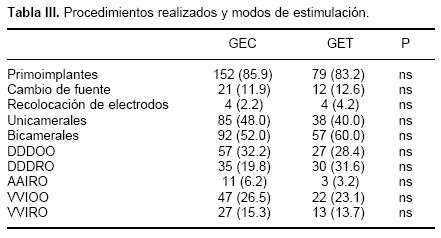 En el GEC 152 (85.9%) fueron primoimplantes, 21 (11.9%) recambio de fuente y 4 (2.2%) recolocación de cables, mientras que en GET fueron 79 (83.2%), 12 (12.6%) y 4 (4.2%) respectivamente (Tabla III), no hubo diferencia estadística entre ambos. Con respecto a los umbrales de estimulación y sensibilidad agudo no se encontraron diferencias significativas entre ambas poblaciones estudiadas (Tabla IV).