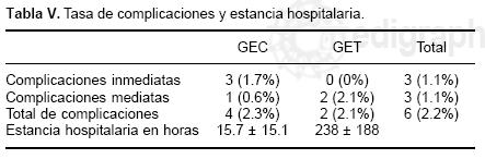 En cuanto a la estancia hospitalaria, aunque no es una comparación real debido a las características del GET, el tiempo de hospitalización del GEC fue de 15.7 ± 15.1 horas, esta estancia puede ser reducida al mejorar la estrategia administrativa más que médica.