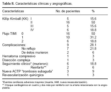 Material y métodos: Tipo de estudio; retrospectivo, observacional, transversal y descriptivo con seguimiento a 30 días. De enero de 2001 a julio de 2004 se realizaron 3,238 procedimientos de ACTP con aplicación de stent a pacientes con diagnóstico de cardiopatía isquémica por aterosclerosis coronaria, se seleccionó a 32 pacientes que representan el 0.98%, con edad de 47 a 79 años promedio de 63, 24 (75%) del sexo masculino, con hipertensión arterial sistémica 29 (90.6%), diabetes mellitus 18 (56.3%), hipercolesterolemia 11 (34.4%), tabaquismo 24 (75%), con antecedentes de angina inestable 9 (28.1%) y con infarto miocardio previo 2 (6.3%). La localización del IAM: anterior extenso 14 (43.8%), anteroseptal en 6 (18.8%), posteroinferior en 5 (15.6%), Pl con extensión eléctrica y/o hemodinámica en VD en 4 (12.5%), lateral en 1 (3.1%). Se trombolizaron en un tiempo promedio 3.19 horas (rango 27) con estreptoquinasa 19 (59.4%) y con rTPA 13 (40.6%), la CPKMB pico (U) promedio de 348 ± 240. Con Killip Kimball (KK) 1 en cinco (15.6%), II 16 (50%), III 5 (15.6%) y IV 6 (18.8%) éstos manejados con balón intraaórtico de contrapulsación.