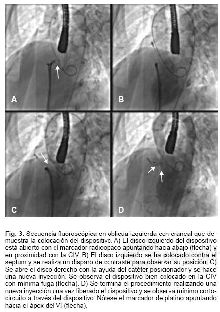 Los pacientes fueron llevados a la sala de cateterismo cardíaco y bajo sedación profunda o anestesia general e intubación orotraqueal, con monitorización continua del ECG y la SaO2 transcutánea, se realizó un ecocardiograma transesofágico (ETE) (HP sonos 1500 con transductor biplanar o multiplanar) y/o ecocardiografía intracardíaca (ICE) (Acusón® Aspen con sistema Acunav®) y se determinó la ubicación y el tamaño exactos del defecto en el septum interventricular. Se puncionaron ambas venas femorales, la izquierda con introductor 10 Fr para el catéter de ICE y la derecha con 8 Fr en dos y 9 Fr en tres casos, y la arteria femoral derecha con introductor 5 Fr, en la forma rutinaria y se llevó a cabo una evaluación hemodinámica completa y se administraron 100 u/kg de heparina. Se introdujo un catéter angiográfico hasta el ventrículo izquierdo y se realizó un angiograma en proyección oblicua anterior izquierda y con angulación craneal para demostrar la comunicación. A continuación se cruza la CIV desde el VI con la ayuda de un catéter Judkins derecho o cobra y se deja una guía de intercambio especial (Amplatzer® Noodlewire) en la arteria pulmonar o la vena cava superior y se sujeta con un lazo desde la vía venosa para formar una asa arteriovenosa. Por la vía venosa se introduce el sistema de liberación (Amplatzer® TorqVue) hasta la aorta ascendente y, con la ayuda del catéter arterial, se posiciona hacia la punta del VI (Fig. 1). Se retiran guías y dilatador y se carga el dispositivo Amplatzer® para CIV perimembranosa. Éste consiste en una malla de alambre de Nitinol (aleación 55% Níquel y 45% Titanio) conformando dos discos autoexpandibles unidos por una cintura corta que se corresponde con el tamaño de la CIV El disco izquierdo es excéntrico y tiene un marcador radio opaco en el borde inferior para permitir su colocación adecuada. El borde superior del disco izquierdo es muy pequeño (0.5 mm) para evitar su interferencia con la función de la válvula aórtica (Fig. 2). Para aumentar su capacidad de cierre, el dispositivo y la cintura se llenan con parches de poliéster cosidos a cada disco por un monofilamento de poliéster. El dispositivo se enrosca en forma segura en un cable de liberación y se carga en un introductor. Se avanza el dispositivo por la camisa del sistema de liberación hasta la punta. Se retira el sistema completo lentamente hasta asegurarse que el dispositivo se podrá abrir sin interferir con el aparato subvalvular mitral. A continuación se abre el disco izquierdo y se retira el sistema completo hasta llegar a la CIV En este momento se realiza una inyección de contraste en el VI y se observan las imágenes de eco para corroborar la posición del disco izquierdo. Si es adecuada se procede a liberar la cintura y el disco derecho. Se comprueba nuevamente la posición y se libera el dispositivo (Fig. 3). Para finalizar, se realiza cateterismo completo y angiografía en el VI y raíz de aorta.