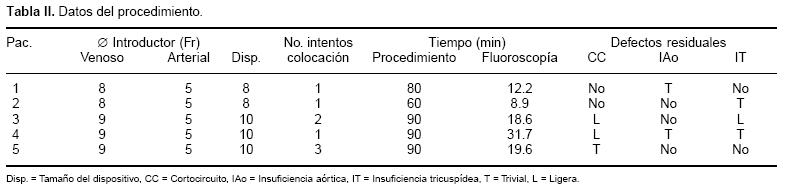 Resultados: En una de las pacientes, no fue posible la colocación adecuada del dispositivo (tasa de éxito con intención de tratamiento 83.3%). En los cinco pacientes restantes el defecto fue único. El diámetro promedio de la CIVpm medido con el ecocardiograma fue de 7 ± 1.7 mm (límites, 5.1 a 9) y medido con angiografía de 6.9 ± 1 (límites, 6 a 8). La presión pulmonar media promedio fue de 20.2 ± 7.7 mm Hg (límites, 1230) y el Qp/Qs de 1.69 ± 0.65 (límites, 1.22.8). Se colocó un dispositivo en todos los pacientes. El control inmediato con angiografía mostró oclusión completa de los defectos en dos pacientes, fuga trivial en uno y fuga ligera en dos. En dos pacientes se registró insuficiencia aórtica residual trivial, preexistente en uno y en tres insuficiencia tricuspídea trivial a ligera, preexistente en todos. En el seguimiento de por lo menos 4 meses, sólo una paciente persiste con cortocircuito residual trivial, en el resto los defectos se observan completamente ocluidos con el ecocardiograma transtorácico.