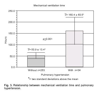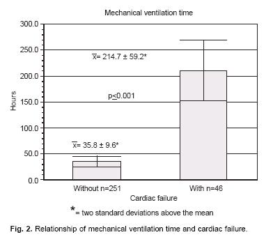 Measurements and main results: Patients with cardiac failure had MVt ime of 214 ± 200 hours, whereas those without it had MV time of 33 ± 73 hours (p > 0.001). Patients with severe pulmonary hypertension had MV time of 160 ± 176 hours, while those who did not had MV time of 47 ± 105 hours (p < 0.001). Twentyfour patients (8.5%) had extubation failure, in 79% them due to hemodynamic alteration during the respiratory support time of 277 ± 188 hours versus the rest of the group with MV time of 41 ± 92 hours (p < 0.001). Factors associated with prolonged MV(> 120 hours) were: patients ages of < 1 year, pulmonary hypertension, and cardiac failure, and represented the greatest risk (90%, Cl 58 to 99) of prolonging MV. Mortality rate was 34% for patients with prolonged MV. Times of aortic clamping and cardiopulmonary bypass were not significant risk factors for prolonged respiratory support.