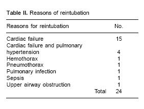 Extubation failure occurred in 24 patients (8%), 20 of whom required prolonged ventilation (83%). In the literature, there are reports of extubation failure in 4.9% to 23%. In patients who need respiratory support for short periods failure of extubation is < 6%, and in those who required mechanical ventilation longer than 48 hours, the failure rate was increased more the 20%, especially in infant patients. The reintubation causes were: obstruction of the upper airway, hypoxia, respiratory acidosis, bronchoaspiration, arrhythmia, encephalopathy, phrenic nerve paralysis, infectious processes, accidental extubation, and cardiac failure. All these conditions contribute to the need for prolonged mechanical ventilation, and as a result, longer stay in the intensive care unit.1014