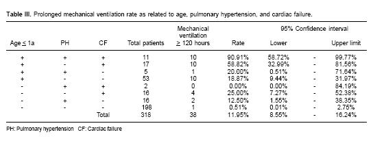 Twentyfour patients (8.5%) had extubation failure in 79% in whom it was due to hemodynamic alteration with respiratory support for 277 ± 188 hours versus the rest of the group with MV for 41 ± 92 hours (p < 0.001) (Table II). With an average age of 1.7 ± 2.2 years of the reintubated versus not reintubated of 5 ± 5 years (p < 0.001). Various factors were examined for likelihood of prolonging MV (> 120 hours). Age younger than 1 year, pulmonary hypertension, and cardiac failure were the principal factors increasing the likelihood for need the prolonged respiratory support in a 91% (CI58 to 99%) (Table III). The risk of death patients with MV lasting more than 120 hours who had, pulmonary hypertension, and cardiac failure was 40% (CI 12 to 73%) (Table IV). A total of 34% of patients with prolonged MV died versus 5% of patients who did not have prolonged MV (p > 0.001), with 6.8 times relative related risk (Table V).