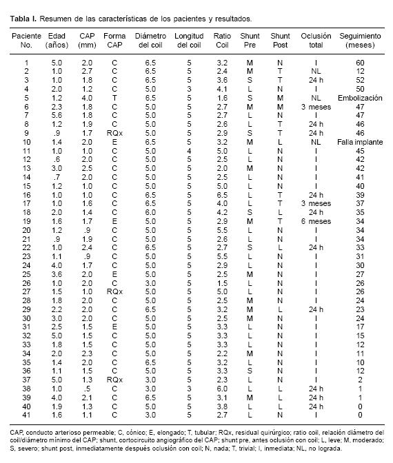 Resultados: En 39/41 pacientes se logró la implantación del dispositivo (95%). La relación media del coil/CAP fue de 3.41 ±1.1. Inmediatamente posterior a la oclusión con el coil, 18 conductos arteriosos no mostraron flujo residual por angiografía; 18 tenían un cortocircuito residual trivial, 3 leve y 2 leve. No se presentaron complicaciones significativas con el procedimiento. En las primeras 24 horas posteriores a la implantación del coil, el control ecocardiográfico mostró oclusión completa en 35 pacientes. En los 4 pacientes con flujo residual, el seguimiento ecocardiográfico demostró ausencia del cortocircuito 3 meses después en 2 pacientes y 6 meses después en un paciente. En uno, no se ha logrado la oclusión completa a un año. En dos pacientes (5%) se abandonó el procedimiento: en un paciente, por mostrar flujo residual moderado y movimiento del extremo pulmonar del coil, que debió de ser retirado con un catéter lazo y en otro, por migración del coil. Ambos pacientes fueron enviados a cirugía. En un seguimiento medio de 29.5 ± 16.5 meses (rango, 0 a 60 meses) de los 39 pacientes, no se observó flujo residual por ecocardiografía Doppler color, excepto en uno.