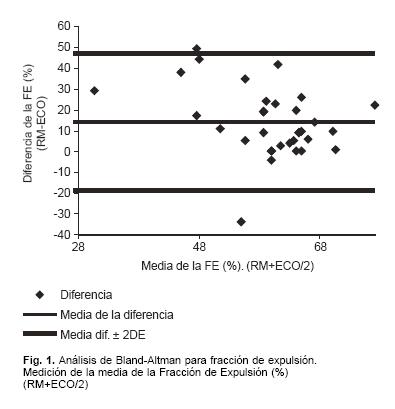 La concordancia entre los dos métodos para la evaluación de estos parámetros es buena, pues como se observa en el análisis visual de BlandAltman, la mayoría se distribuyen cerca del promedio y son pocos los valores extremos por arriba o debajo de dos desviaciones estándar (Figs. 1,2 y 3).