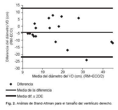 Method: We included 45 patients with clinical suspicion of severe congenital cardiopathy A magnetic resonance and a transthoracic echocardiogram were performed and the anatomy and size of the cardiac cavities were compared. Descriptive statistics were used and BlandAltman test was used to analyze concordance between both methods.