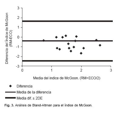 La concordancia entre ambos métodos respecto a la fracción de expulsión, el diámetro diastólico del ventrículo izquierdo, el tamaño del ventrículo derecho y el índice de McGoon se evaluaron mediante el análisis propuesto por BlandAltman.6