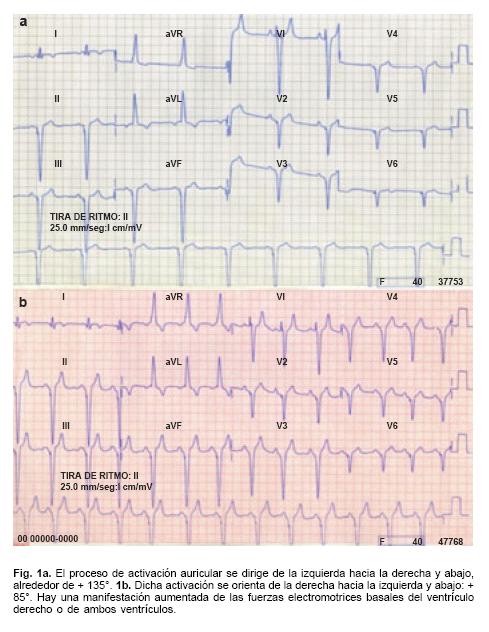 El electrocardiograma de superficie mostró la existencia de marcapaso migratorio en 6 casos (54.5%), como en el ejemplo correspondiente a la Figura 1. En éste, se observa la orientación de la activación auricular de izquierda hacia la derecha y abajo: + 130° (Fig. 1a), que alterna con una activación dirigida de derecha hacia la izquierda y abajo: + 85° (Fig. 1b). Hay también manifestación aumentada de las fuerzas electromotrices ventriculares básales.