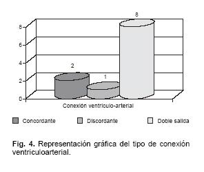 La conexión ventriculoarterial más frecuente fue la doble salida en 8 (72.76%), concordante en 2 (18.2%) y discordante en uno (9%), (Fig. 4). Todos los casos tuvieron obstrucción pulmonar. En 2 casos se encontró hipoplasia del anillo, tronco y ramas de la arteria pulmonar y en dos sólo hipoplasia del tronco de la arteria pulmonar y las ramas pulmonares eran confluentes y bien desarrolladas. Seis casos tuvieron estenosis pulmonar cuatro mixta (subvalvular y valvular), uno subvalvular y el otro valvular con tronco y ramas pulmonares confluentes y bien desarrolladas. Un paciente tenía atresia pulmonar con ramas pulmonares no confluentes. El arco aórtico no mostró obstrucciones y fue derecho en 8 pacientes (72.7%) y entres izquierdo (27.3%).