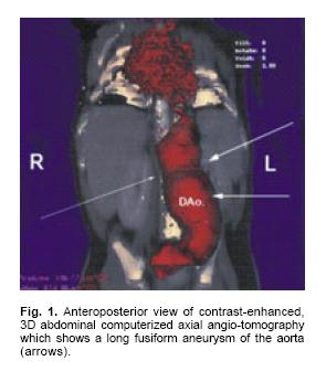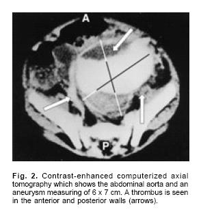 Contrastenhanced, 3D abdominal computerized axial angiotomography corroborated the presence of a fusiform aneurysm of the aorta, extending 13.5 cm from the diaphragm to the iliac arteries with a thrombus in its distal portion, near the iliac vessels. It involved the renal and mesenteric arteries, and dissected the aortic wall, clearly apparent in a computerized axial tomography at the abdominal level; there an aortic dissection a thrombus in the abdominal aortic wall was also seen (Figs. 1 and 2). The patient died suddenly as a result of the dissection of the aorta.
