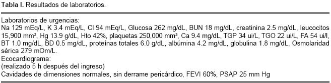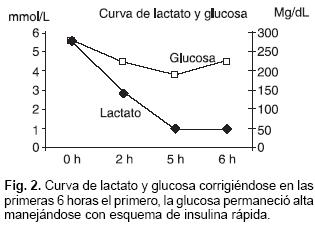 Reanimamos con líquidos, gluconato de calcio 4 g, dopamina que se tituló a 10 µg/kg/min y norepinefrina 15 µg/min, a pesar de manejo persistió chocado, con ritmo nodal y frecuencia cardíaca 40 por minuto; ECG con ritmo nodal y conduciendo con bloqueo de rama derecha de haz de His (Fig. 1), se decidió colocar marcapaso temporal (FC 70 por minuto). Se trasladó a UTI donde se recibió hipotenso (TA 79/39 mm Hg), con dopamina a 10 µg/ kg/min y norepinefrina 15 µg/kg/min, en ritmo de marcapaso y anúrico. Se administró 2 g de gluconato de calcio e hidrocortisona por choque refractario (se sospechó en crisis suprarrenal), solución salina al 0.9% a 1,000 mL/hora, dos horas después se auscultaron estertores crepitantes en ambos hemitórax, PVC 17 cm H2O, oximetría de pulso 89% (FIO2 100%); se realizó radiografía de tórax en la que se evidenció hipertensión venocapilar pulmonar; se inició ventilación no invasiva con IPAP 12, EPAP 6 H2O, FIO2 40%, se logra TAM 55 mm Hg y decidimos administrar furosemide 100 mg/dL mejorando la congestión pulmonar y los parámetros ventilatorios. El lactato sérico progresivamente disminuyó hasta valores normales a las 5 h. La hiperglucemia se corrigió hasta las 16 horas con insulina rápida subcutánea (Fig. 2).