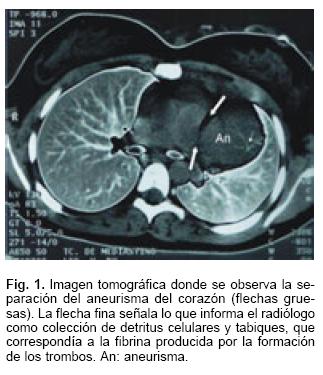 Presentamos una paciente de piel blanca, femenina, de 15 años de edad con antecedentes de asma bronquial y amigdalitis a repetición, que tres días previos al ingreso presentó cefalea, entumecimiento del brazo izquierdo y lenguaje tropeloso. En el electrocardiograma apareció fibrilación auricular con respuesta ventricular aceptable y en la radiografía de tórax se constató cardiomegalia por lo que se decide realizar ecocardiograma donde se observa un aneurisma del apéndice auricular izquierdo. Con este diagnóstico y el de embolismo cerebral, se inicia anticoagulación oral y se remite a nuestro centro donde se repite ecocardiograma que informa: imagen paracardíaca izquierda ecolúcida, de aproximadamente 67 x 75 mm, que se extiende hasta la punta del ventrículo izquierdo y comprime totalmente la AI, aparentando un gran derrame pericárdico, con imágenes de trombos en su interior; además, un patrón de pseudoestenosis mitral ligera. Se constató la relación de la AI con el aneurisma, pero no logramos demostrar paso de flujo a través del defecto con el Doppler color. Desgraciadamente en ese momento, la sonda del ecocardiograma transesofágico, no estaba apta para su uso, por lo que decidimos realizar tomografía axial computada (TAC) que mostró: gruesa imagen hipodensa de 40 a 45 UH, paracardíaca izquierda, de 7 x 8 centímetros que tiene barrera de seguridad entre ella y la silueta cardíaca y en su interior aparecen imágenes compatibles con colección de detritus celulares y tabiques. La impresión diagnóstica del radiólogo fue de un tumor mediastinal que podía corresponderse con un hematoma crónico o una colección de otra naturaleza (Fig. 1).