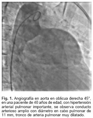 Métodos y resultados: Entre enero de 2000 a marzo de 2005, 53 pacientes adultos (47 mujeres y 6 hombres) con conducto arterioso fueron referidos para su cierre vía percutánea. La edad media fue 25.3 años (rango 16 a 59.7 años). Se utilizaron 3 diferentes dispositivos: Cuarenta pacientes con Amplatzer para conducto arterioso, 1 con Amplatzer para comunicación interventricular muscular, 11 con coils de Gianturco y 1 paciente con Nitocclud. Todos los dispositivos fueron implantados con éxito. La completa oclusión inmediata fue vista en 31 pacientes (58.4%), en 20 pacientes (37.7%) con fuga trivial y en 2 pacientes (3.89%) con fuga ligera. La presión pulmonar sistólica previa tuvo una media de 37.08 ± 22.8 mm Hg (rango12138 mm Hg) y disminuyó a 28.75 ± 10.25 mm Hg (rango 1657 mm Hg) con una p < 0.001. El tiempo de seguimiento media fue de 16.8 meses (rango 0.9 a 51.8 meses) la oclusión fue completa en el 100%. En ningún paciente se observaron complicaciones relacionadas a la implantación de los dispositivos.