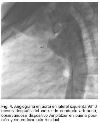 De enero de 2000 a marzo del 2005 se realizó cierre por vía percutánea de conducto arterioso a 53 pacientes en la edad adulta en nuestra institución. Todos los pacientes se evaluaron clínicamente y con ecocardiograma y en algunos además se les realizó cateterismo cardíaco previo a su cierre. En todos se realizó el abordaje por vena y arteria femorales, con toma de oximetrías y presiones. Se realizaron angiografías aórticas en posición lateral izquierda 90° y en ocasiones en oblicua derecha 45° con catéter angiográfico cola de cochino 6 Fr. Se les realizaron mediciones al conducto arterioso en su diámetro del lado aórtico, del pulmonar y su longitud. De acuerdo al diámetro del lado pulmonar se eligió el tipo de dispositivo, así como el tamaño del mismo. Se realizó angiografía en posición lateral izquierda 90° u oblicua derecha 45° antes de liberar el dispositivo y posterior a su liberación para determinar la posición del dispositivo y el grado de cortocircuito residual (Figs. 1, 2, 3 y 4). Se administró profilaxis antibiótica con cefalotina una dosis previa al procedimiento y 3 dosis después a intervalos de 8 horas. No se utilizó heparina durante el procedimiento. Los pacientes se egresaron de 24 a 48 horas después del procedimiento con profilaxis de endocarditis por 6 meses. Se continuó su control en consulta externa para evaluación clínica y ecocardiográfica para valorar cortocircuito residual.