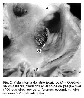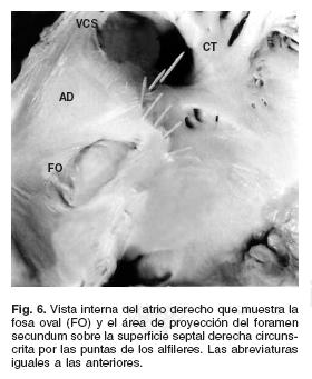 Para clasificar los defectos septales el tabique interatrial se dividió en cinco zonas que correspondieron a los sitios potenciales de presentación (Fig. 1); cuando el defecto septal involucró a dos o más zonas del tabique se consideró dentro del grupo mixto. Se incluyó un espécimen con comunicación entre el seno venoso coronario y el atrio izquierdo que aunque no es un verdadero DSA funciona como tal. Además, se estudiaron veintiséis corazones normales con FO permeable en los que se insertaron alfileres en el borde del pliegue oval de la superficie septal izquierda para proyectar el área del FS sobre la cara derecha del tabique interatrial (Fig. 2). Se elaboró una correlación anatomoembriológica para cada tipo de defecto septal basada en el conocimiento de la morfogénesis de la tabicación atrial y en la anatomía patológica de cada defecto para inferir los posibles mecanismos patogénicos.