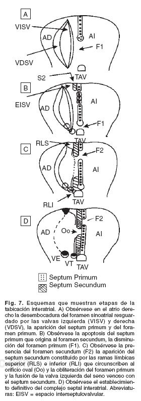 En el embrión del horizonte XII de Streeter16 el SP aparece en la región media del techo del atrio común en forma de un pliegue sagital semilunar que crece en dirección de las almohadillas endocárdicas del canal atrioventricular, entre ambas estructuras se localiza el FP a través del cual pasa sangre de derecha a izquierda (Fig. 7A). Este foramen se hace cada vez más pequeño a medida que desciende el SP hacia las almohadillas atrioventriculares; en la parte cefálica del SP aparecen múltiples zonas de apoptosis que al confluir forman el FS (Fig. 7B). En este horizonte se oblitera el FP al unirse el borde inferior del SP con esas almohadillas que se han fusionado entre sí para formar el tabique atrioventricular; el establecimiento del FS asegura el paso de sangre de derecha a izquierda. Al mismo tiempo aparece un segundo tabique en el espacio interseptulovalvular denominado SS; tiene forma semilunar con dos ramas límbicas superior e inferior, esta última se fusiona con las alhomadillas endocárdicas atrioventriculares (Fig. 7C). Este tabique es incompleto ya que presenta un orificio de forma oval circunscrito por las ramas límbicas, el cual ocupa un nivel inferior con respecto al FS (Fig. 7D). En la mayoría de los casos las ramas límbicas se doblan y se unen frente a la desembocadura de la vena cava inferior, lo que forma el anillo completo del orificio oval. En algunos corazones las dos ramas límbicas permanecen sin unirse entre sí lo que originan el anillo incompleto del orificio oval. La valva izquierda del seno venoso se fusiona con la cara derecha del SS. El SP y el SS se fusionan en la parte superior mientras que en la parte inferior quedan separados y el SP constituye la válvula del orificio oval, que se proyecta hacia el atrio izquierdo.17 El complejo septal interatrial funciona como un mecanismo valvular que permite el paso de sangre de derecha a izquierda, primero a través del orificio oval, luego por el espacio comprendido entre ambos tabiques y finalmente por el FS. El borde de la rama límbica superior se denomina crista dividens ya que separa la corriente sanguínea de la vena cava inferior en dos, una altamente oxigenada proveniente de la placenta que pasa hacia el atrio izquierdo a través del orificio oval y del FS y la otra predominantemente venosa que pasa del atrio derecho al ventrículo derecho. En el nacimiento disminuye la presión en el atrio derecho y aumenta en el atrio izquierdo, por lo que la parte cefálica de la válvula del orificio oval (SP) es presionada contra el SS, y posteriormente en un alto porcentaje de casos ambos tabiques se fusionan y los atrios quedan completamente separados; este proceso ocurre en etapas variables de la vida postnatal. Los bordes gruesos de las ramas límbicas del SS circunscriben la depresión denominada orificio o fosa oval cuyo piso está constituido por el SP (Fig. 6). Cuando la fusión de ambos tabiques interatriales no ocurre persiste la condición fetal denominada orificio oval permeable.