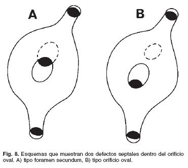 Malformación del orificio oval (00): Ya se señaló que cada tabique interatrial cubre la comunicación presente en el tabique opuesto debido a que el orificio oval y el FS están situados en diferentes niveles. Se sugieren dos mecanismos patogenéticos para este tipo de defecto septal: la apoptosis ectópica y excesiva en el SP y el retardo en el crecimiento del SS. Cuando la apoptosis en el SP es excesiva se forma un FS de mayor tamaño que lo normal por lo que se superpone al orificio oval; ésta es la razón por la que la mayoría de los autores anglosajones denominan a este defecto FS; sin embargo la nómina anatómica de las cardiopatías congénitas señala que cualquier defecto septal ubicado dentro de los confines del limbo de la fosa oval debe denominarse tipo orificio oval o fosa ovalis (Fig. 8A). Puede ocurrir apoptosis en el SP fuera de la zona en la que se ubica el FS. Por lo que el defecto es independiente y está separado de dicho foramen y queda ubicado dentro de los confines del orificio oval por lo que debe llamarse malformación del orificio oval (Fig. 8B). El otro mecanismo patogenético es el crecimiento incompleto de las ramas límbicas del SS, por lo que el orificio oval queda de mayor tamaño y se superpone al FS que posee dimensiones normales. Los defectos septales más frecuentes asientan dentro de los confines del orificio oval y coinciden con el sitio en el que se establece el cortocircuito de derecha a izquierda durante la vida embrionaria y fetal.
