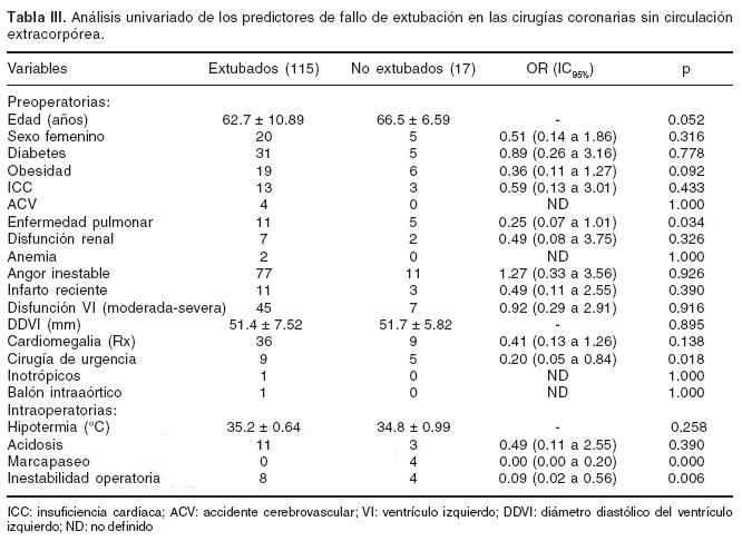 En cuanto a la cirugía coronaria sin CEC, el análisis univariado reveló que el antecedente de enfermedad pulmonar, la cirugía de urgencia, la necesidad de marcapaseo intraoperatorio y la inestabilidad hemodinámica durante la "luxación" del corazón se asociaron a fallo de extubación (Tabla III); mientras que el análisis multivariante señaló a la necesidad de marcapaseo, la inestabilidad hemodinámica durante el procedimiento y la obesidad como variables relacionadas con la imposibilidad de extubar en el quirófano. Aunque no alcanzó el nivel de p previsto, la edad más avanzada podría ser otra de las variables asociadas a fallo de extubación.