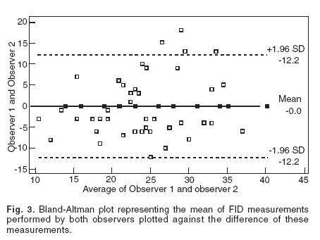 Twenty patients were enrolled into the study (12 women and 8 men). The mean age of the participants was 43 ± 16 years. Table I provides baseline brachial artery diameters, responses to reactive hyperemia and isorbide challenge for the study cohort. Excelent correlation was observed for all brachial artery measures with a Spearman's correlation coefficient > 0.9 (p < 0.0001). FMD in the study population was of 10.45 ± 6.9%. Flow independent dilation (FID) was of 24.35 ± 7.63 % (Both results were means of the 3 measures recorded by each observer). Intraobserver variability was of 2.1% for observer A and 1.1% for observer B. Fig. 2, represents a BlandAltman plot of FMD performed by both observers (Interobserver variability). Fig. 3, is a BlandAltman plot of FID also performed by both observers. 8 patients were found to have endothelial dysfunction according to the first observer against 9 according to the second observer for a Cohen's kappa of 0.89.