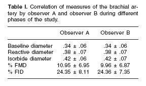 Results: Excellent correlation was observed for all brachial artery measures with a Spearman's correlation coefficient > 0.9 (p < 0.0001). Flowmediated dilation (FMD) in the study population was of 10.45 ± 6.9%. Flow independent dilation (FID) was of 24.35 ± 7.63%. Intraobserver variability was of 2.1 % for observer A and 1.1 % for observer B.