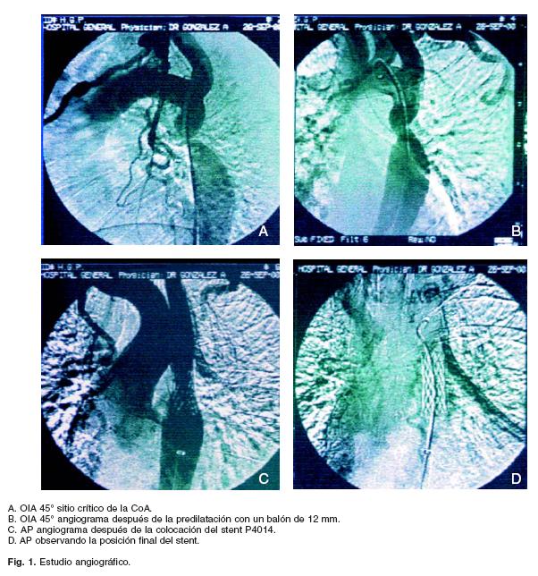 Resultados: Fueron 7 pacientes tratados con angioplastía y stent P4014; 6 hombres y 1 mujer; el promedio de edad fue 24.14 ± 8.57 años. El gradiente promedio transcoartación fue de 80 mm Hg. El gradiente residual posterior al tratamiento endovascular fue de 4 mm Hg. Se encontró insuficiencia aórtica en 4 de los 7 pacientes que mejoró notablemente después del tratamiento, así como la hipertensión arterial; quedando sólo 3 pacientes con 1 solo fármaco para su control.