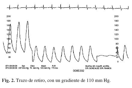 En el caso No. 1 el gradiente medido por ecocardiografía a los 3 meses fue de 20 mm Hg y esto seguramente fue secundario a la IAo moderada residual, que con el Doppler se ha visto incrementada en relación a la medición pico a pico del trazo de retiro que realizamos inmediatamente después del procedimiento y que sólo mostró 7 mm Hg de gradiente residual.