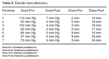 El gradiente residual promedio fue de 4 mm Hg (0 a 7 mm Hg) con un gradiente previo de 80.7 mm Hg (37 a 120 mm Hg) y si tomamos en cuenta sólo el gradiente en los 6 pacientes con CoAo de importante repercusión hemodinámica, el gradiente promedio fue de 88 mm Hg; (60 a 120 mm Hg ) el diámetro intrastent promedio postangioplastía fue de 16.42 + 2.07 mm; con un diámetro previo de 3.42 + 0.78 mm (Tabla II). No hubo hipertensión paradójica en ninguno de los pacientes, tampoco la necesidad de transfundirlos, no se presentaron reacciones vagales y las pequeñas disecciones fueron cubiertas por los stents.