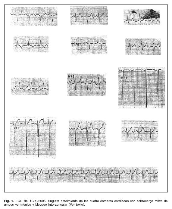 Un trazado registrado el 13 de noviembre de 2005 (Fig. 1) sugería crecimiento de las cuatro cámaras cardíacas por los datos siguientes. Onda P bimodal en Dn, Dffl y de V3 a V6 con duración de 170 mseg e intervalo de 140 mseg entre los dos modos. RS en V2 con TIDI = 40 mseg, rS de V3 a V5 con S profunda = 65 mm en V4 y 40 mm en V5, R > S en aVF con TIDI = 45 mseg. Las ondas T acuminadas de alto voltaje en aVF y V6 hacían pensar en una sobrecarga diastólica del ventrículo izquierdo y el intervalo importante entre los dos modos de la onda P sugería un bloqueo interauricular, debido probablemente a fibrosis de la aurícula izquierda.